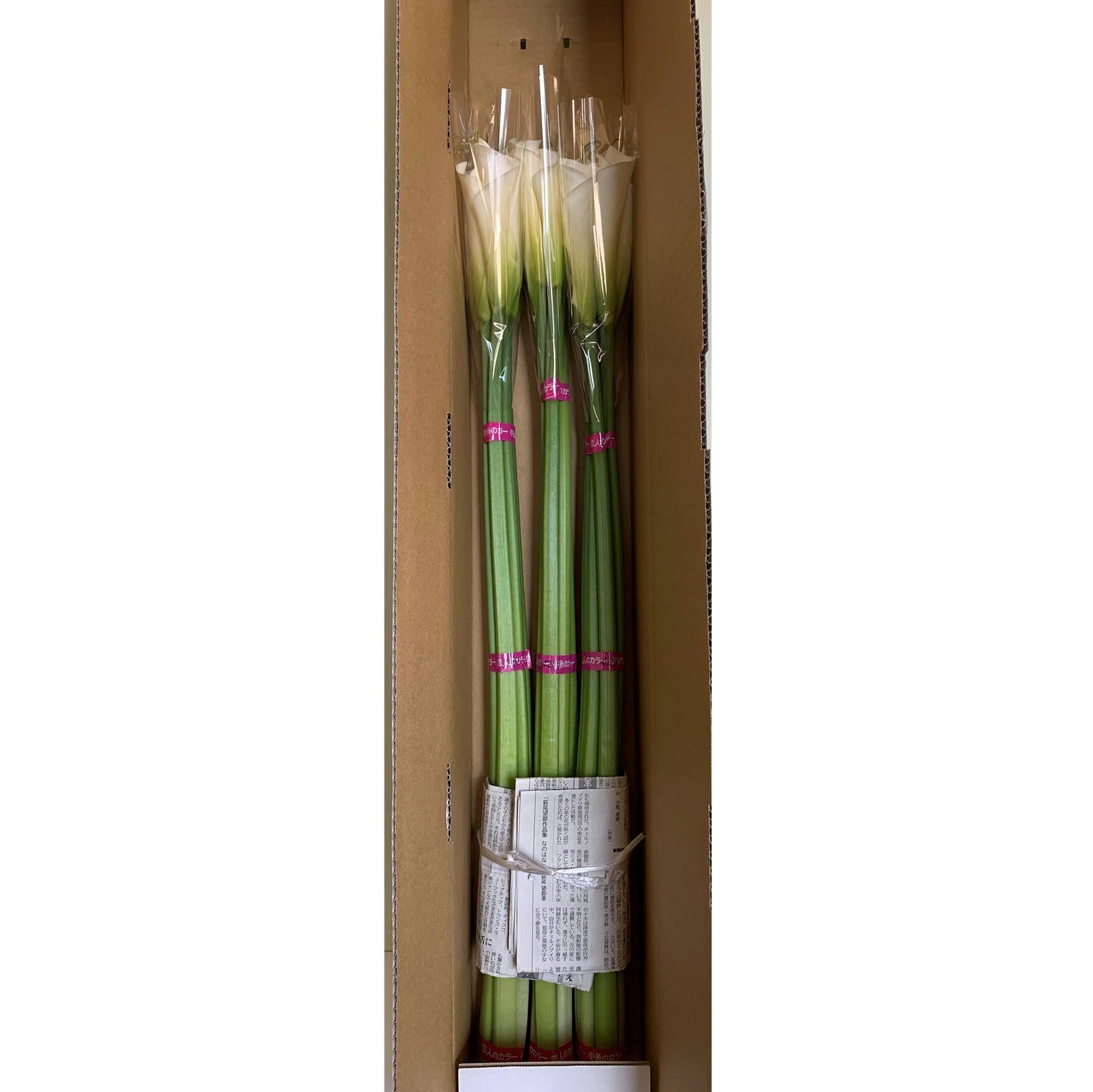 ・細めの箱に5本1束×3束で詰めて発送いたします。